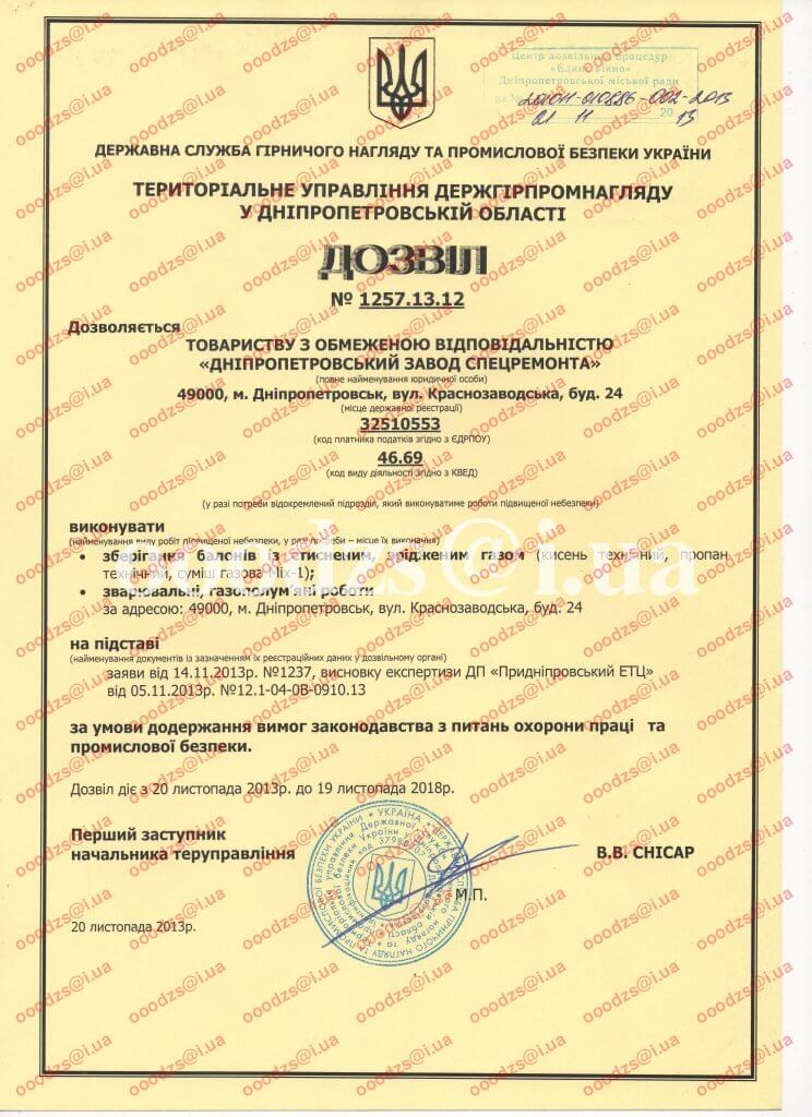 - Дозвіл №1257.13.12 зберігання балонів зі стисненим та зрідженим газом, зварювальні та газополум'яні роботи.