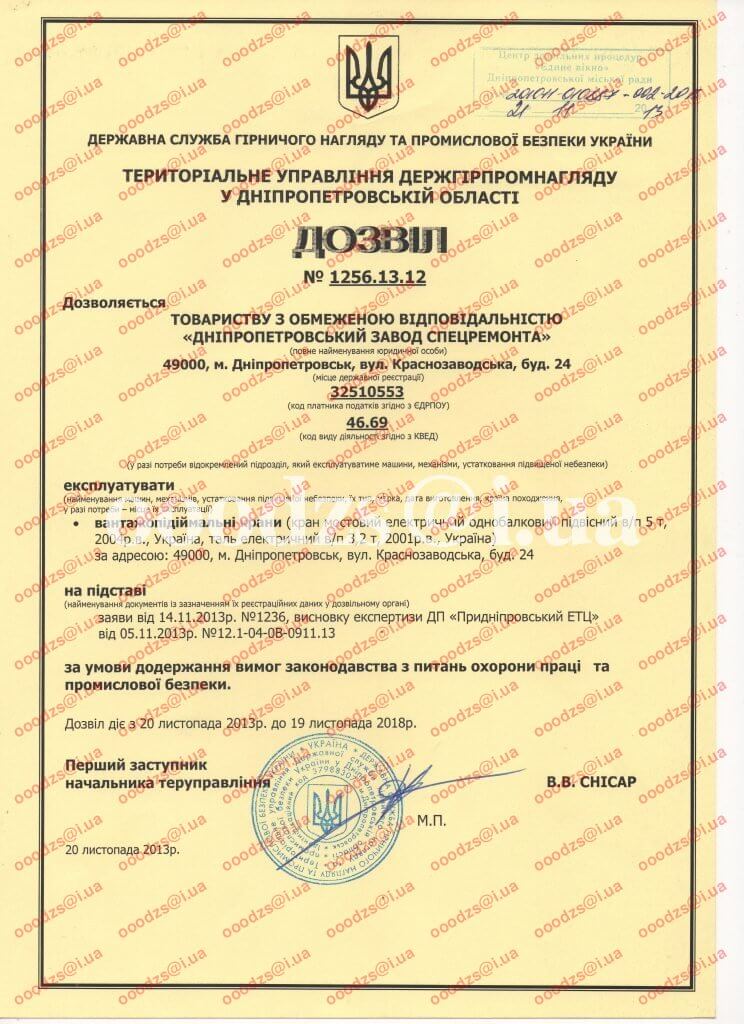- Дозвіл №1256.13.12 експлуатувати вантажопідйомні крани.