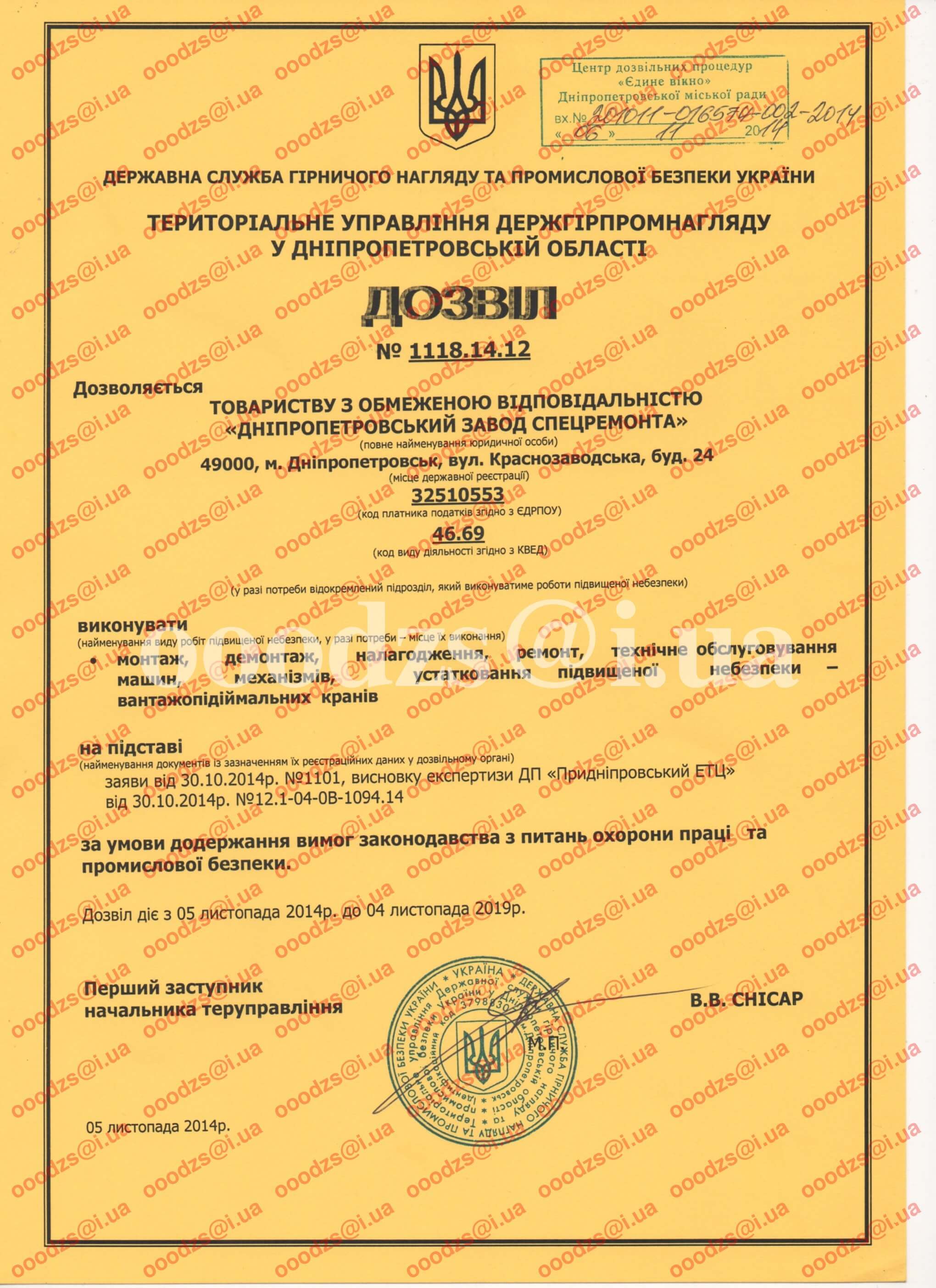 - Дозвіл №1118.14.12 на виконання монтажу, демонтажу, налагодження, ремонт, технічне обслуговування машин та механізмів в умовах підвищеної безпеки – вантажопідіймальних кранів.