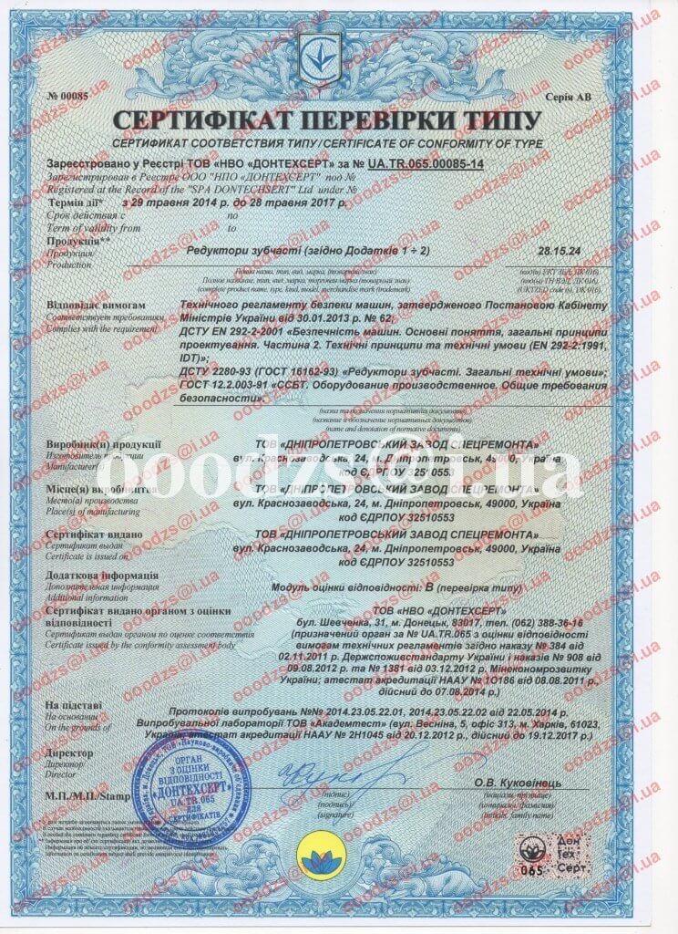 - Сертифікат відповідності типу на зубчасті редуктори.